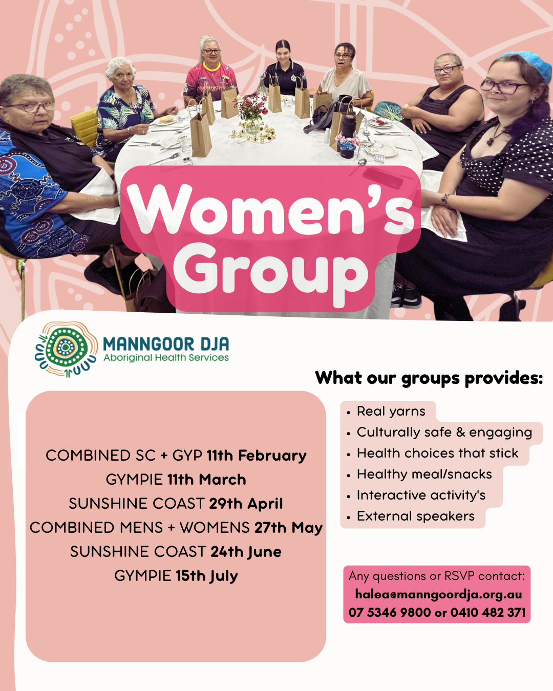 To stay up to date with upcoming sessions, activities and announcements, we encourage members to join our Women’s Group Facebook page.